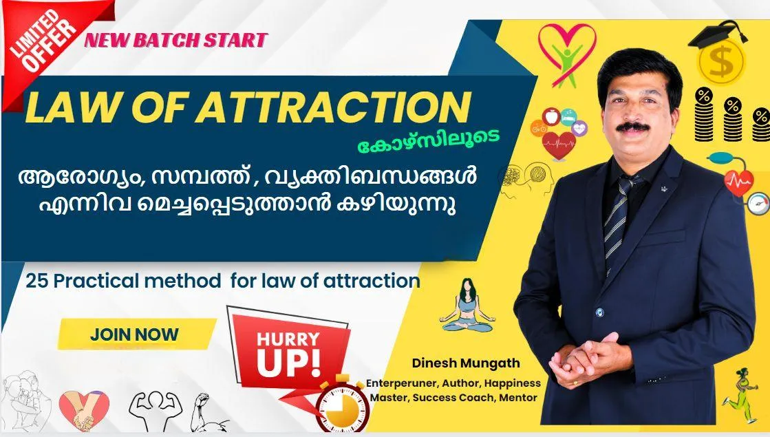 Dinesh Mungath’s “Akarshana Niyamam” is a transformational Malayalam guidebook on the Law of Attraction, explaining how our thoughts, emotions, and beliefs can shape our destiny. Rooted in both Indian spiritual wisdom and modern neuroscience, the book teaches practical ways to: